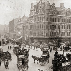 Another mixture of amazing old world buildings travel vehicles people etc